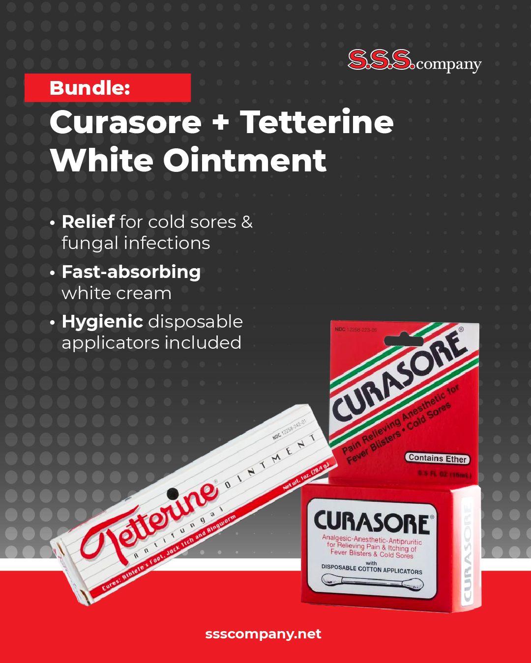 - Targeted Relief Duo: Addresses both cold sore pain (Curasore) and fungal infections (Tetterine White).